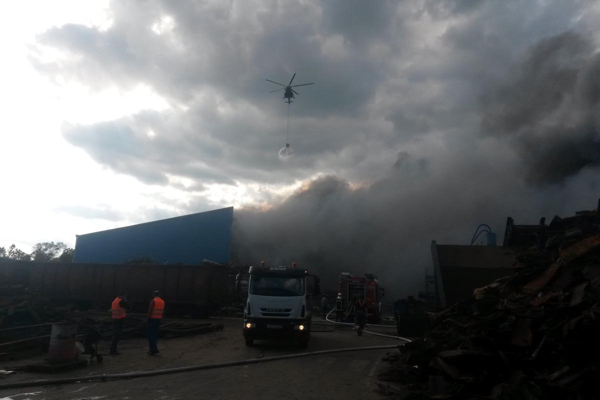 Croatian military helicopter fights fire in the industrial waste depot in Zagreb