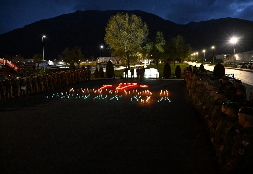 Members of the 43rd Croatian Contingent deployed to NATO’s Kosovo Force (KFOR) at the “Villaggio Italia” military camp in Peć, Republic of Kosovo, created a candle illustration of the Vukovar Water Tower and formed the names of Vukovar and Škabrnja in front of the central cross.