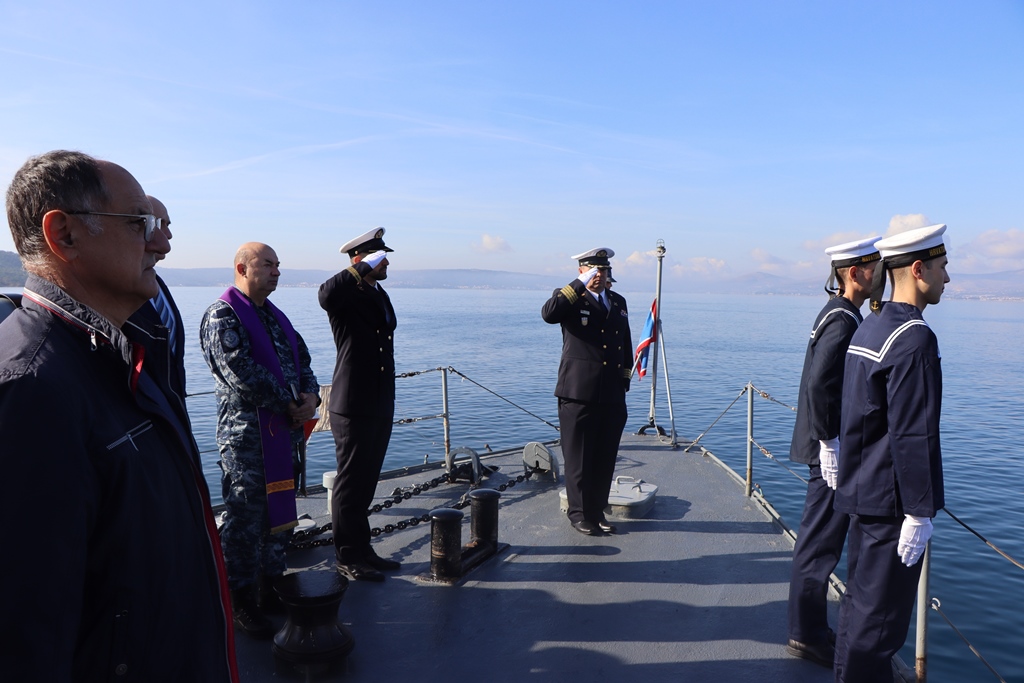 Posada broda Hrvatske ratne mornarice raketna topovnjača RTOP-21 “Šibenik” u Kaštelanskom zaljevu položila vijenac u more u spomen na hrvatske mornare
