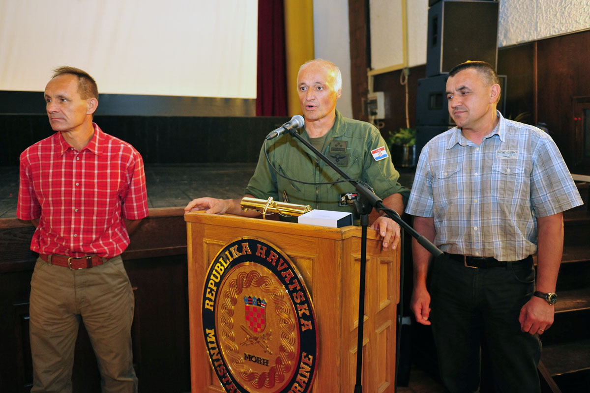Pozdravljajući okupljene goste i uzvanike, ekipu autora filma te zahvaljujući prisutnim pilotima koji su svojim sjećanjima pridonijeli stvaranju filma “Uvučeno-neutralno-konus”, o.d. zapovjednika HRZ i PZO-a brigadni general Dražen Šćuri rekao je “Naše Oružane snage se ponose svojim herojima, onima koji su poginuli za domovinu i žive u našim sjećanjima, ali i onima koji su naše kolege i koji još uvijek svojim radom doprinose razvoju oružanih snaga. I danas imamo samozatajnih i vrijednih pojedinaca koji su zlatnim slovima pisali najljepše stranice naše povijesti.”