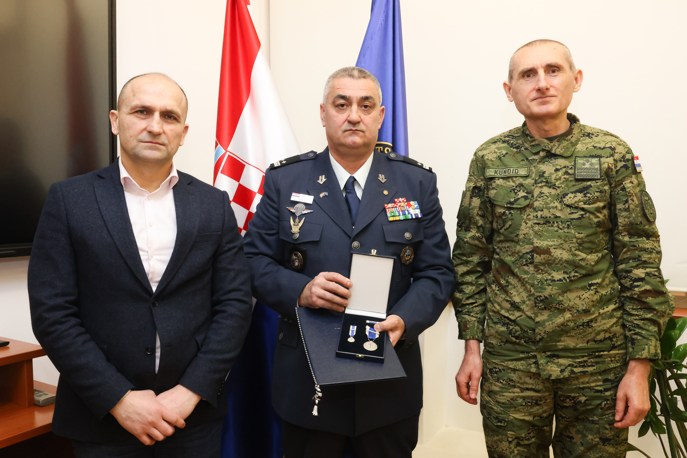 Potpredsjednik Vlade Republike Hrvatske i ministar obrane Ivan Anušić i načelnik Glavnog stožera Oružanih snaga RH general-pukovnik Tihomir Kundid u ponedjeljak, 16. veljače 2026., u Ministarstvu obrane primili su pukovnika Zlatka Sudića odlikovanog NATO-ovom medaljom za zasluge na razini glavnog tajnika NATO-a.