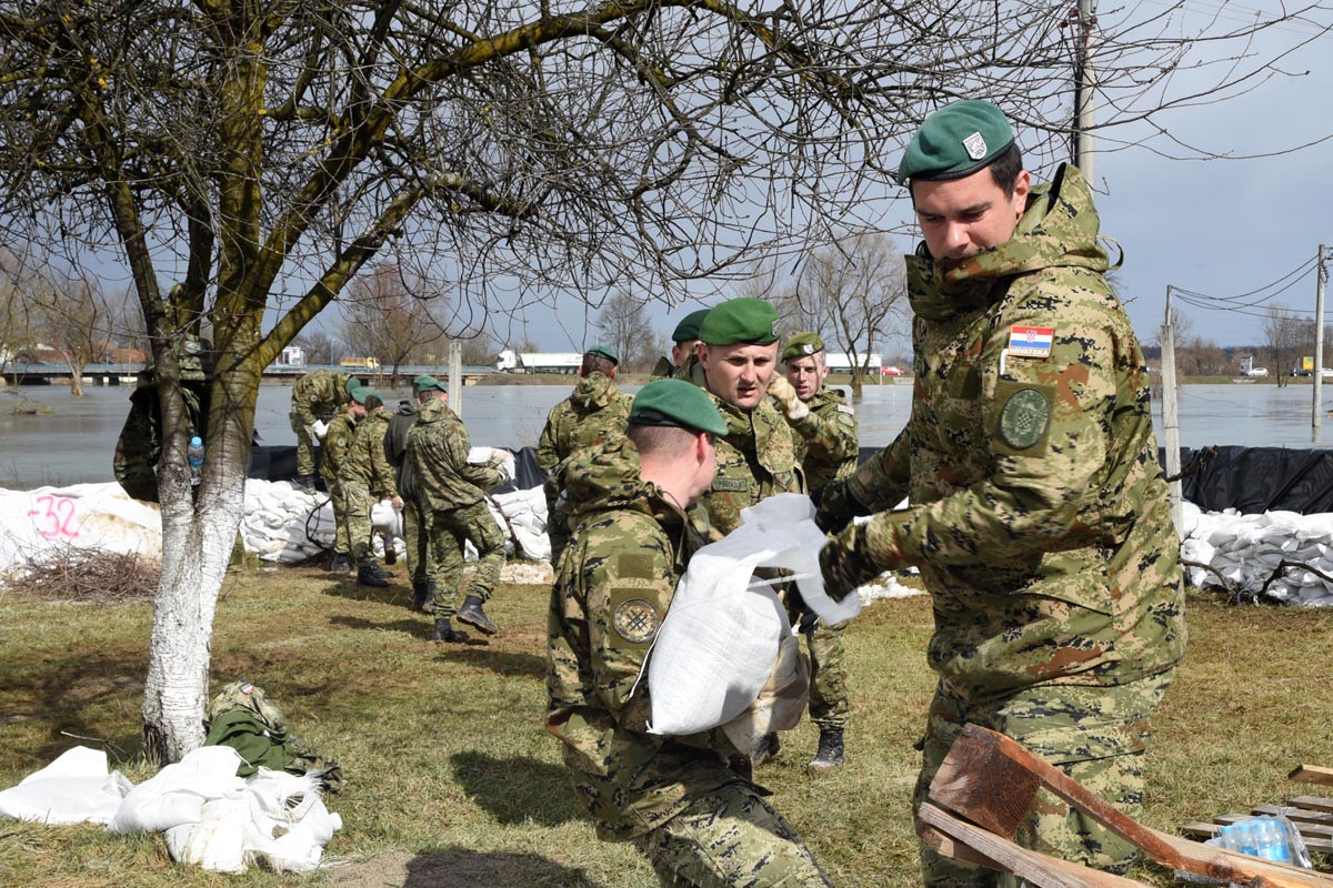 Pripadnici OS RH, njih 100, sa 12 motornih vozila angažirani su na punjenju vreća i izgradnji zečjih nasipa kao pomoć u obrani od poplava